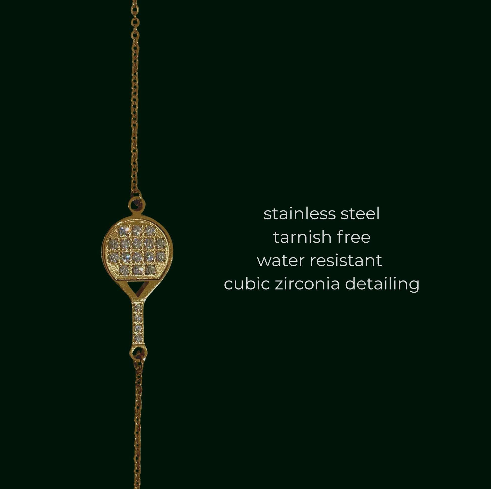 This gold-tone stainless steel bracelet features a miniature padel racket charm with sparkling cubic zirconia detailing, blending sport influence with a clean, minimal aesthetic.